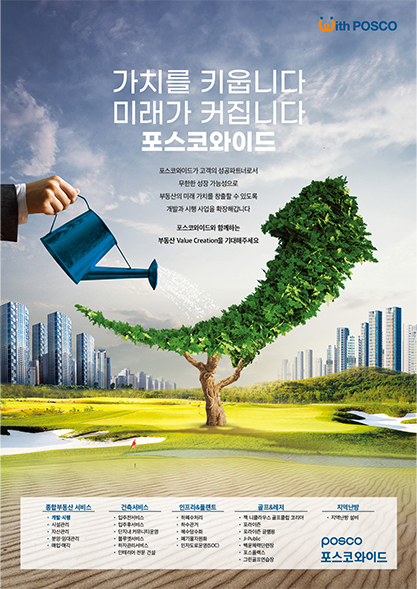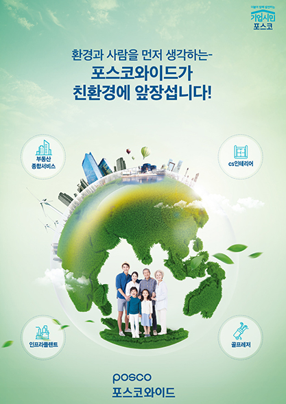 포스코와이드는 종합부동산서비스, 건축, 인프라·플랜트, 골프·레저 분야에서 종합관리 전문 서비스를 제공하며 든든한 고객의 성공 파트너 역할을 수행해 왔다. 현재는 운영, 관리 등 한정된 역할에서 벗어나 개발, 시행의 부동산 Value Creation 사업으로 업역을 확장해 나아가고 있다. 이에 따라 '가치' , '미래' , '환경' , '사람'을 키워드로 삼아 성장하는 나무와 지구를 이미지를 구성하였습니다.