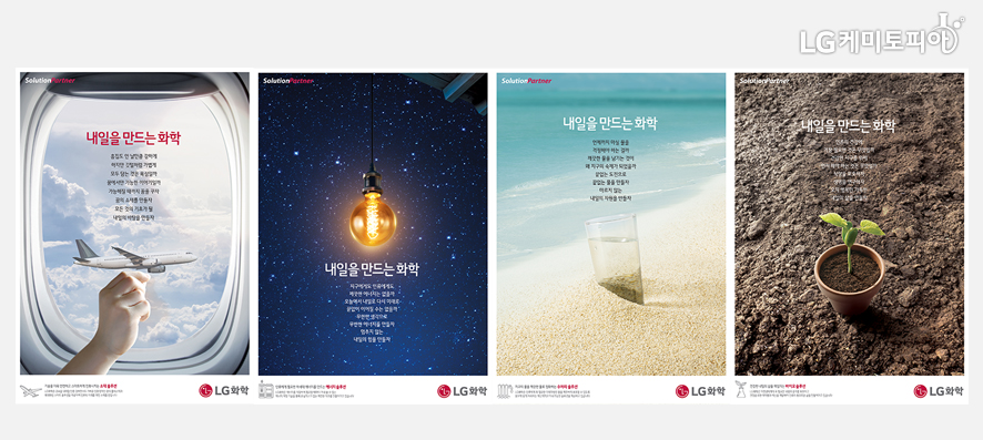 lg화학은 ‘인류의 삶을 풍요롭게 만드는 기업’이라는 광고 콘셉으로 한 개의 통합안으로 광고를 제작할 경우 각각의 사업부문에 대한 깊이 있는 이야기를 꺼낼 수 없다는 문제점을 시리즈 광고를 통해 차근차근 풀어서 에너지, 물, 바이오, 기초소재 등 네 가지 사업부문을 어둠을 밝히는 전구, 컵에 담긴 바닷물, 새싹, 비행기 등 심플한 상징요소를 적용해 각 오브제에 맞게 사업부문의 특성을 표현할 수 있는 카피와 이미지를 구성했습니다.